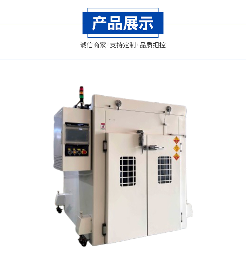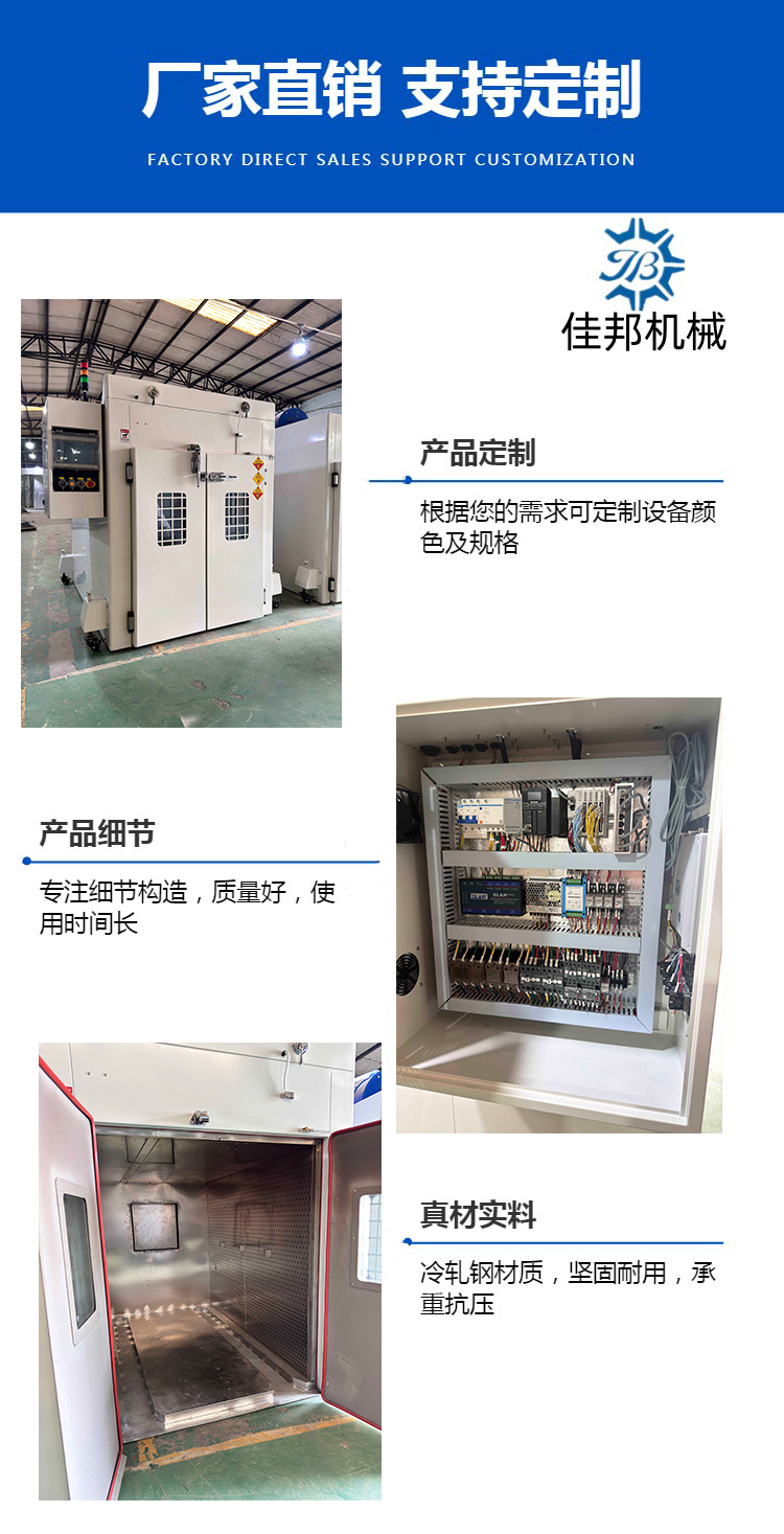 一 设备名称:工业烤箱 型号:JB-KXS-1350-A 1 规格尺寸:规格:内尺寸高1350mm*宽1100mm*深1800mm 外尺寸:高2050mm*宽1400*深2050mm(按实际制作为准) 2 电源:电压380V /50HZ 三相五线 总功率:大约 26KW 3 箱体加固材质:采用40mm*40mm国标角铁焊接制作. 4 箱体外围板:釆用1.5m厚冷轧钢板(强度、塑性和焊接综合性能最好)折弯焊接制作。 外壳颜色:烤粉处理,颜色为外壳喷粉灰白色RLA9002一种色,门,箱体,电箱都为一种色。 5 保温材料 1。采用120K/100MM加密型硅酸铝岩棉: 2。具有不可燃烧,隔热性强等特点,厚度为100mm。(保证正常使用下, 烘烤200度, 外箱壳体温度不超55度)(门边及接缝处除外) 6 箱体内部材质:釆用1.2mm厚sus304不锈钢板.砂面板冲孔折弯焊制作,保持内胆清洁无尘、防生锈、耐腐蚀,易清洗; 7 箱体底板:釆用中间保温层50mm和地面平铺5mm不锈钢板贴地开槽式,槽口倒角C80.方便工装车推入 ,底部外两侧采用3寸万向脚轮,可方便推动。(轮子做成可活动整个可拆卸)。 8 加热系统:发热器材使用耐高温SUS304不锈钢电热管,电热管每条 2 KW* 12条,正常使用是.常温+20至200度可调; 升温时间常温+10至150度空载20分钟)( 空载恒温15分钟后±2度以内),波动度性±2度。 9 运风采用:佳邦牌750W长轴耐高温专用型马达配10.5寸钢千叶风轮., 使炉内温度均匀,共2套。 10 密封材料: 密封条采用e字型硅胶条制作,可耐温不变形,门与内胆采用双层密封形式,加强密封效果。 11 1, 双开门设计,从两侧开启; 2,安装304不锈钢冷库门锁,内部可主动应急开门。 3. 开2个可视化窗口,真空玻璃,窗口带有防护网。 4. 门外配有机械式防关门装置。 12 烤箱背面开1个泄爆门,尺寸450mm*450mm 13 电控系统:电箱.总制开关.电流表, 电压表,SSR(厦门宇电)交流接触器(施耐德)、烤箱内超温保护器,报警器,切项保护,开关.耐高温电线.电览线.等一批国标电器开关组成.其它电器采用正泰品牌。(PLC由客户提供) 二 设备名称:冷风箱 型号:JB-KXS-1350-B 1 规格尺寸:规格:内尺寸高1350mm*宽1100mm*深1800mm 外尺寸:高2050mm*宽1400*深2050mm(按实际制作为准) 2 电源:电压380V /50HZ 三相五线 总功率:大约 1.5 KW 3 箱体加固材质:采用40mm*40mm国标角铁焊接制作. 4 箱体外围板:釆用1.5m厚冷轧钢板(强度、塑性和焊接综合性能最好)折弯焊接制作。 外壳颜色:烤粉处理,颜色为外壳喷粉灰白色RLA9002一种色,门,箱体,电箱都为一种色。 5 保温材料 1。采用120K/50MM加密型硅酸铝岩棉: 2。具有不可燃烧,隔热性强等特点,厚度为50mm。 6 箱体内部材质:釆用1.2mm厚sus304不锈钢板.砂面板冲孔折弯焊制作,保持内胆清洁无尘、防生锈、耐腐蚀,易清洗; 7 箱体底板:釆用和地面平铺5mm不锈钢板贴地开槽式,中间不用做保温层,槽口倒角C80.方便工装车推入 ,底部外两侧采用3寸万向脚轮,可方便推动。 8 冷却系统: 1. 由买方提供单管制冷大一匹风机1台,接进风管到冷风箱的接口。 2. 由卖方安装2台750W离心风机。 9 密封材料: 密封条采用e字型硅胶条制作,可耐温不变形,门与内胆采用双层密封形式,加强密封效果。 10 1. 双开门设计,从两侧开启; 2.开2个可视化窗口,真空玻璃, 3.门外配有机械式防关门装置。 11 电控系统:电箱.开关.耐高温电线.电览线.等一批国标电器开关组成.其它电器采用正泰品牌。