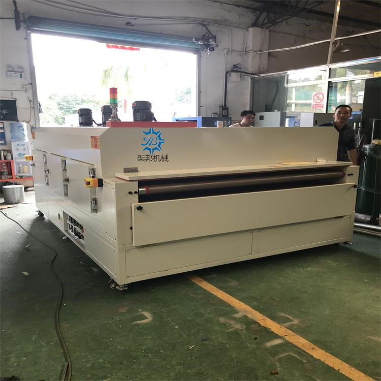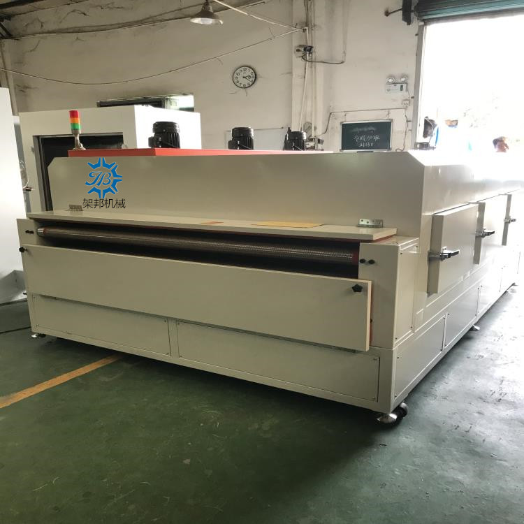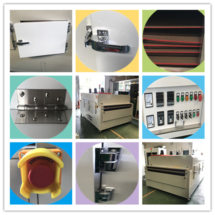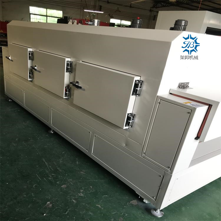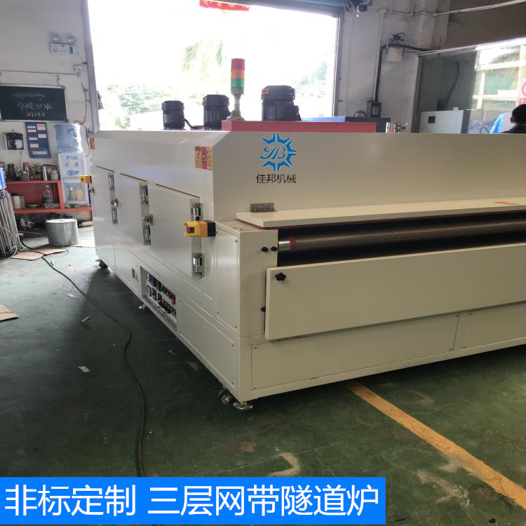佳 邦 感 谢 您 的 到 来 我司可根据贵司的要求加工定制各种电热工业烤箱、高温烤箱、IR隧道炉、Uv固化炉、PVC生产线、喷油水濂柜、自动喷油线、整套涂装设备等。 一 工业隧道炉: 总长3000mm*内宽1800mm(外宽2160mm)*高960mm(炉盖长2500mm *段炉口高度50mm) 上料区250mm/下料区250mm 1 电源:电压380V 总功率:大约40KW 2 脚架材质:采用50mm*50mm国标方通焊接制作.; 3 炉体外围板釆用1.5mm厚冷板折弯焊接制作; 4 炉体保温材质:采用K100*100mm厚岩棉制作; 5 炉体内部材质:釆用1.2mm厚sus201不锈钢板折弯焊接制作; 6 温控系统:发热器材使用304不绣钢带散热片电热管,正常使用温度,常温至180℃可调, 7 运风采用:长轴耐高温专用型马达配千叶风轮. 使炉内温度均匀,。 8 机头.机尾封板用1.2mm厚冷板折弯焊接制作; 9 传送系统:传送系统:输送带采用耐280度以内的铁氟龙网带,机头主滚筒采用包胶滚筒,机尾主滚筒采用压花滚筒.托带滚筒采用用滚筒。 10 速度控制:采用减速马达,1:10. 配变频器链条组成.速度快慢可调(每分钟3米-10米/可调) 11 电控系统:总制开关, 电流表, 电压表,交流接触器) 配SSR, 温控器(RKC)切项保护、开关.指示灯.耐高温电线.电览线.等一批国标电器开关组成.方便易懂. 12 炉盖一侧配有升降电子杆, 方便隧道炉内以后维修