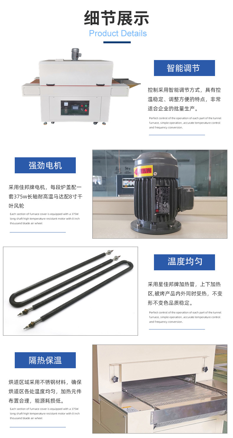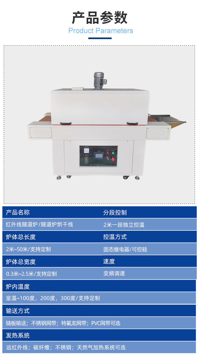 隧道炉采用电加热方式,分段独立加热,每段烘道温度人工设定,自动控温。原理是由风机把冷风送至安装在烘箱内风道壁上的电加热元件,加热为热风并经导流板从底部进入烘道烘干产品,热风与产品热交换后携带大量潮气经顶部排潮口排出烘箱外。产品运行是从烘箱一端进入,由链条、齿轮、滚筒托架使产品运行,产品烘干或定型后从另一端出来。由调速电机来调整运行速度,以达到理想的干燥效果和产量。隧道炉运行具有平稳,操作简便,热效率好等优点.